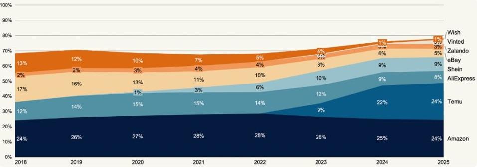 亚马逊在国际调查中也录得24%的份额。从这个角度来看,亚马逊和Temu加起来占据了所有跨境销售的近一半。顺便说一下,订单份额并不能反映平台上的支出水平;可以假设,Temu上的平均订单价值显著低于亚马逊。